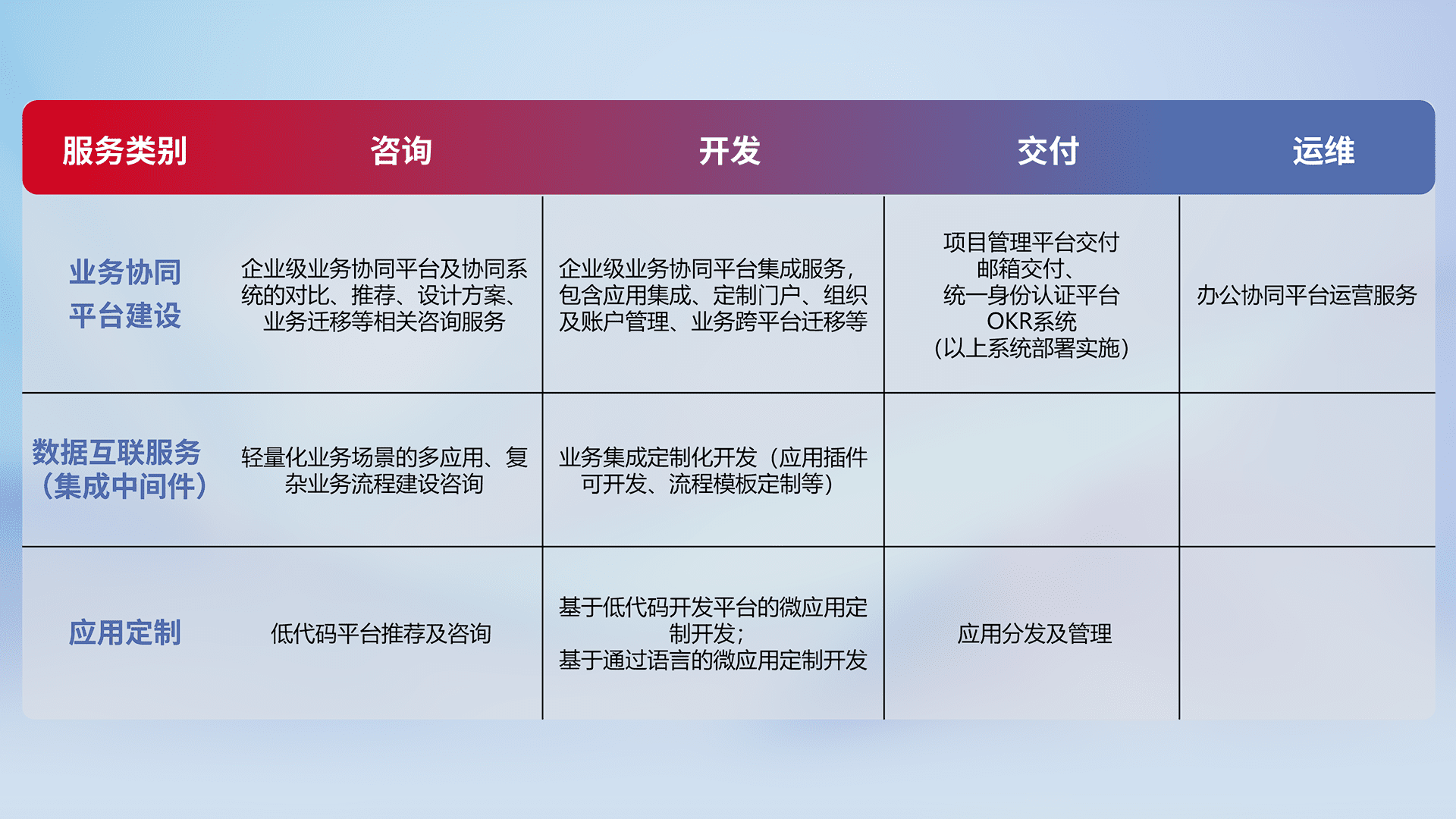 针对钉钉、、企微、、、、IDaas等平台级产品提供产品的规划、、方案、、、、交付、、定制化开发等服务,,,实现如统一协同办公、、、智能客户服务、、、混合会议管理、、、智能数据查询、、、等业务场景,,,,实现数字化转型。。。