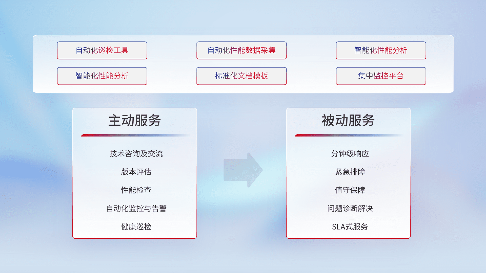 智能化工具和标准化文档,,,保障服务质量,,,,提供主动服务(包含技术咨询、、、、版本评估、、、性能检查、、、自动化监控与告警、、健康巡检)和被动服务包含(分钟级响应、、、、紧急排障、、、、值守保障、、、、问题诊断解决、、、SLA服务)。。。。