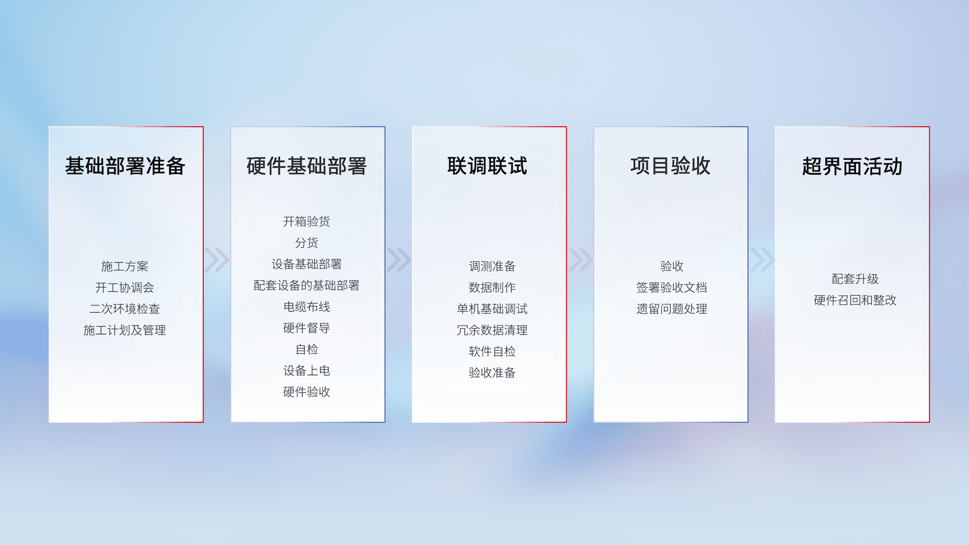 从基础部署准备、、硬件基础部署、、、、联调联试、、项目验收、、、越界面活动的全过程可追溯,,保证施工质量和进度。。